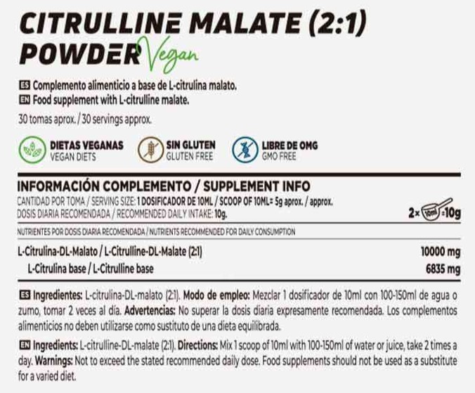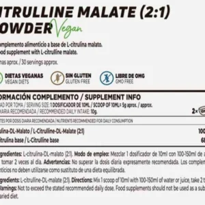 Citrulina malato en polvo es un complemento alimenticio en polvo vegano, a base de sales de citrulina de ácido málico. La Citrulina malato se crea a partir de la combinación de L-citrulina con el anión DL-malato.