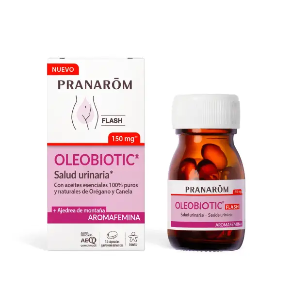 Las cápsulas de salud urinaria Oleobiotic® FLASH contienen una sinergia de Aceites Esenciales de Orégano, Canela y Ajedrea y están enriquecidas con Aceite Esencial de Hinojo, que ayuda al buen funcionamiento de las vías urinarias.